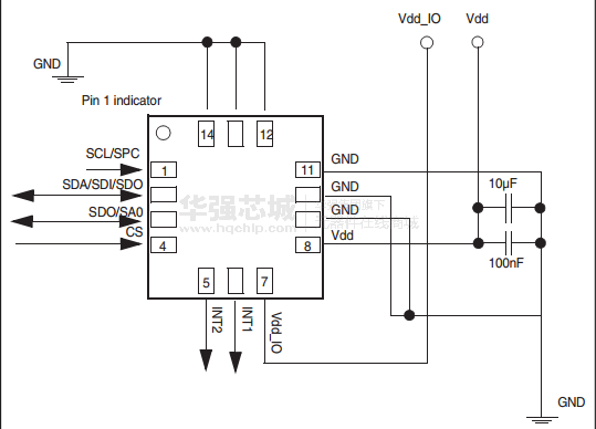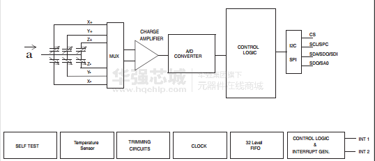 lis2de动态用户可选的全尺度的±2g/±4G /±8g /±16G和能够测量加速度的输出数据速率从1赫兹到5千赫。自检功能允许用户检查传感器在最终应用程序的功能。该装置可用于产生由两个独立的惯性唤醒/自由落体事件以及设备本身的位置中断信号。阈值和中断发生器的时间是可编程的终端用户的飞行。lis2de集成了一个32级的先入先出(FIFO)缓冲器允许用户以限制存储数据的主机处理器干预。在一个小的lis2de薄塑料栅格阵列(LGA)封装,可它是保证工作在扩展的温度范围从- 40°C + 85°