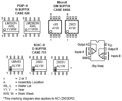 The LM393 series are dual independent precision voltage comparators capable of single or split supply operation. These devices are designed to permit a common mode range-to-ground level with single supply operation. Input offset voltage specifications as low as 2.0 mV make this device an excellent selection for many applications in consumer automotive and industrial electronics.