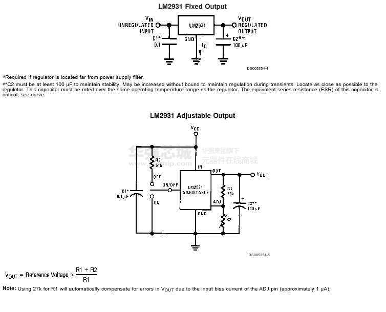 The LM2931 series consists of positive fixed and adjustable output low dropout (LDO) linear voltage regulators that are specifically designed to maintain proper regulation with an extremely low input-to-output voltage differential. These devices are capable of supplying output currents in excess of 100 mA and feature a low bias current of 0.4 mA at 10 mA output. Designed primarily to survive in the harsh automotive environment, these devices will protect all external load circuitry from input fault conditions caused by reverse battery connection, two battery jump starts, and excessive line transients during load dump. This series also includes internal current limiting, thermal shutdown, and additionally, is able to withstand temporary power-up with mirror-image insertion. Due to the low dropout voltage and bias current specifications, the LM2931 series is ideally suited for battery powered industrial and consumer equipment where an extension of useful battery life is desirable. The 'C' suffix adjustable output regulators feature an output inhibit pin which is extremely useful in microprocessor-based systems.
