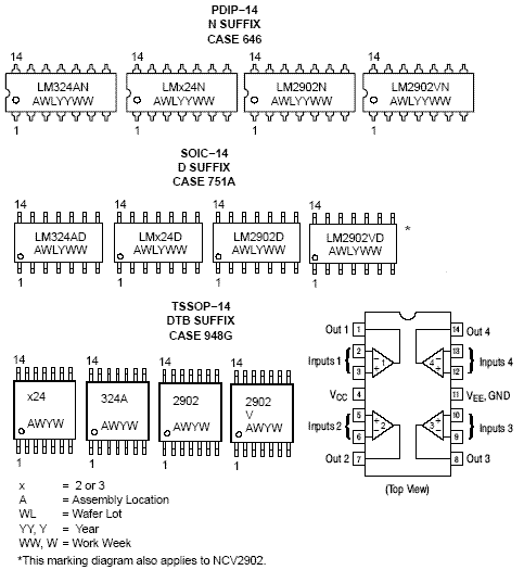 The LM324 series are low-cost, quad op-amps with true differential inputs. They have several distinct advantages over standard operational amplifier types in single supply applications. The quad amplifier can operate at supply voltages as low as 3.0 V or as high as 32 V with quiescent currents about one-fifth of those associated with the MC1741 (on a per amplifier basis). The common mode input range includes the negative supply, thereby eliminating the necessity for external biasing components in many applications. The output voltage range also includes the negative power supply voltage.