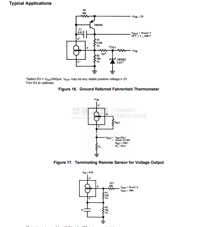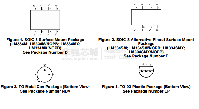 描述 The LM134/LM234/LM334 are 3-terminal adjustable current sources featuring 10,000:1 range in operating current, excellent current regulation and a wide dynamic voltage range of 1V to 40V. Current is established with one external resistor and no other parts are required. Initial current accuracy is ±3%. The LM134/LM234/LM334 are true floating current sources with no separate power supply connections. In addition, reverse applied voltages of up to 20V will draw only a few dozen microamperes of current, allowing the devices to act as both a rectifier and current source in AC applications.The sense voltage used to establish operating current in the LM134 is 64mV at 25°C and is directly proportional to absolute temperature (°K). The simplest one external resistor connection, then, generates a current with ≈+0.33%/°C temperature dependence. Zero drift operation can be obtained by adding one extra resistor and a diode.Applications for the current sources include bias networks, surge protection, low power reference, ramp generation, LED driver, and temperature sensing. The LM234-3 and LM234-6 are specified as true temperature sensors with ensured initial accuracy of ±3°C and ±6°C, respectively. These devices are ideal in remote sense applications because series resistance in long wire runs does not affect accuracy. In addition, only 2 wires are required.The LM134 is specified over a temperature range of −55°C to +125°C, the LM234 from −25°C to +100°C and the LM334 from 0°C to +70°C. These devices are available in TO hermetic, TO-92 and SOIC-8 plastic packages.特性Operates From 1V to 40V 0.02%/V Current Regulation Programmable From 1µA to 10mA True 2-Terminal Operation Available as Fully Specified Temperature Sensor ±3% Initial Accuracy All trademarks are the property of their respective owners.