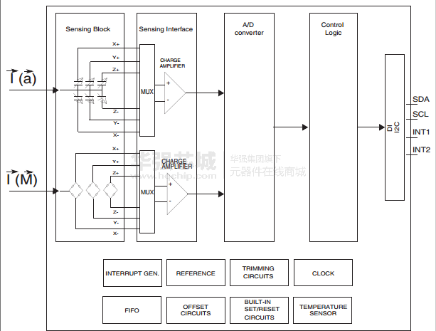 lsm303dlhc的包装具有三维线性加速度传感器和三维数字磁传感器系统。
