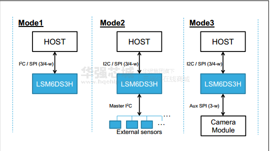 lsm6ds3h陀螺仪支持OIS / EIS的应用。该装置可通过专用辅助SPI连接摄像头模块(模式3)在主界面的灵活性是可用的(I2C和SPI)。