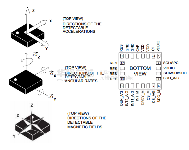 lsm9ds1这包装具有三维线性加速度传感器系统、三维数字角速率传感器,和一个三维数字磁传感器。