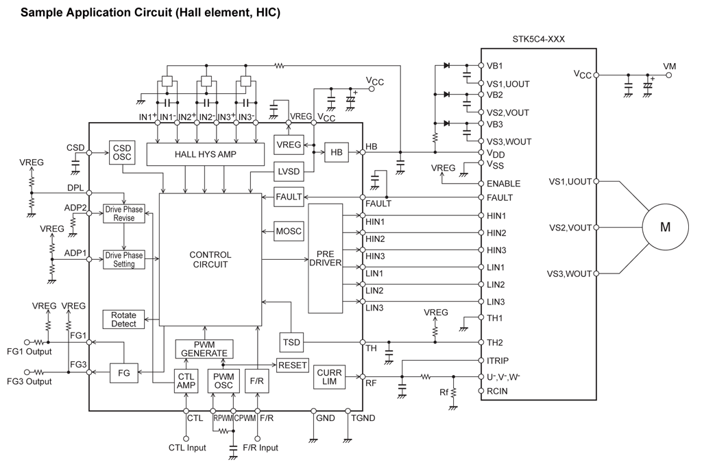 - Supports drive phase control (15° lead angle for 150° current-carrying drive. From this state, a lead angle from 0 to 28° can be set in 16 steps)