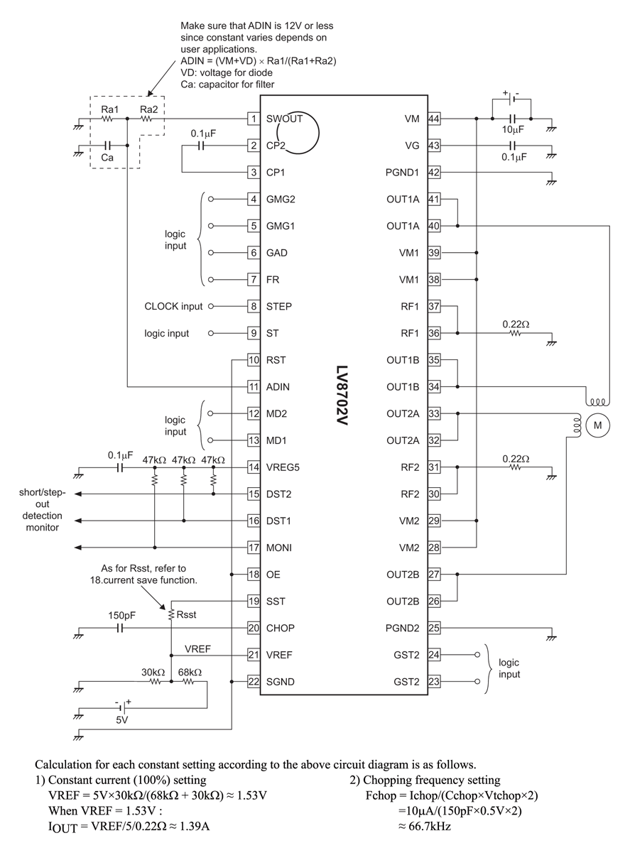 The LV8702V is a 2-channel Full-bridge driver IC that can drive a stepper motor driver, which is capable of micro-step drive and supports quarter step. Current is controlled according to motor load and rotational speed at half step, half step full-torque and quarter step excitation, thereby highly efficient drive is realized. Consequently, the reduction of power consumption, heat generation, vibration and noise is achieved.