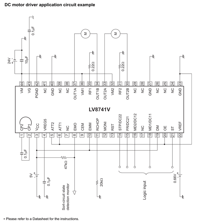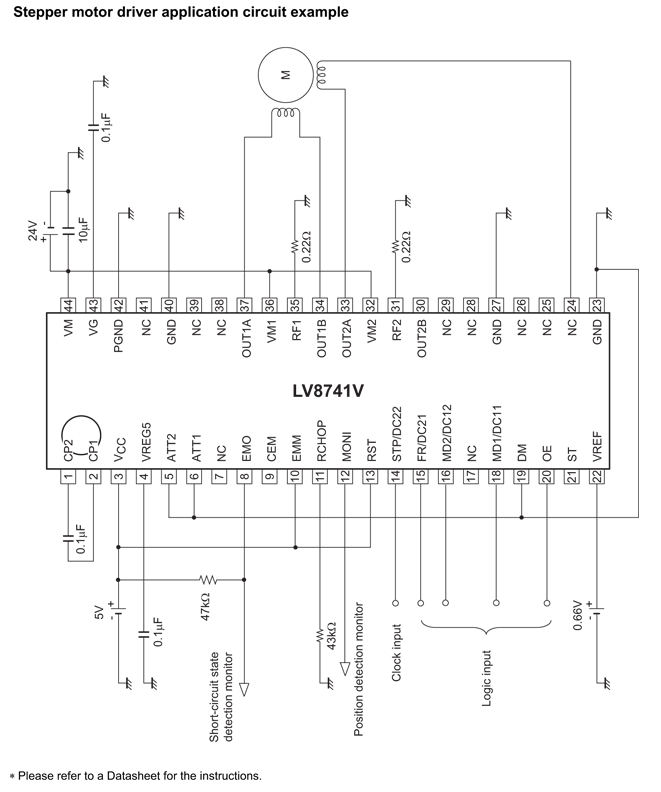 The LV8741V is a 2-channel H-bridge driver IC that can switch a stepper motor driver, which is capable of micro-step drive and supports Quarter-step excitation, and two channels of a brushed motor driver, which supports forward, reverse, brake, and standby of a motor. It is ideally suited for driving brushed DC motors and stepper motors used in office equipment and amusement applications.