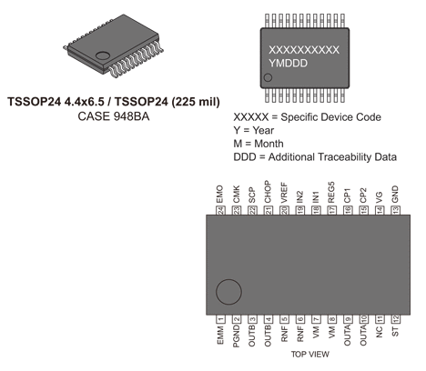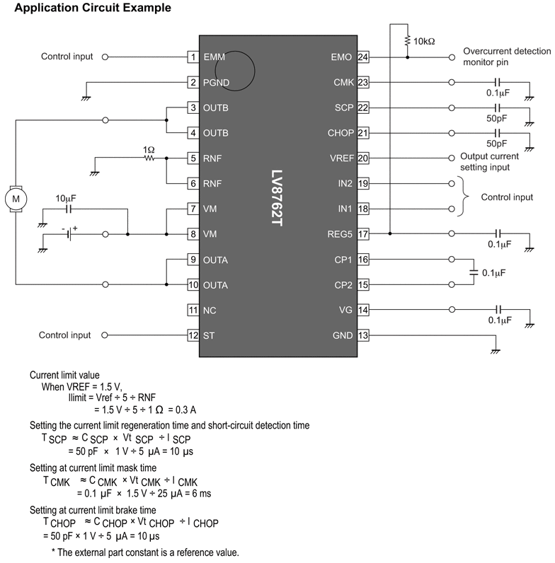 The LV8762T is a 1-channel H-bridge driver that can control four operation modes (forward, reverse, brake, and standby) of a motor. The LV8762T is optimal for use in driving brushed DC motors for office equipment.