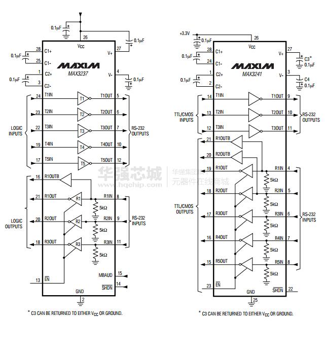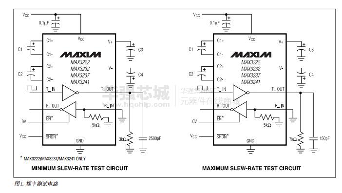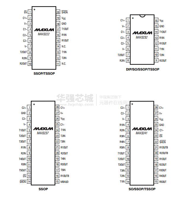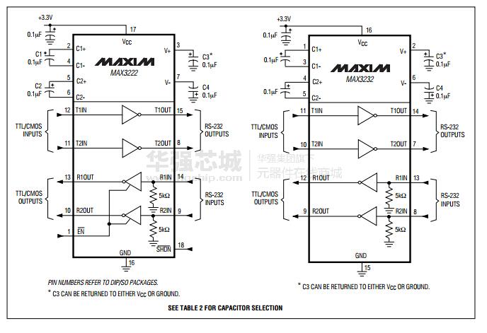 MAX3222E/MAX3232E包括两个发送器和两个接收器;MAX3222E具有1µA关断模式,可降低电池供电便携式系统的功耗。关断模式下,MAX3222E接收器仍保持有效状态,允许监视外设,而且仅消耗1µA的电源电流。MAX3222E和MAX3232E的引脚、封装和功能分别兼容于工业标准的MAX242和MAX232。