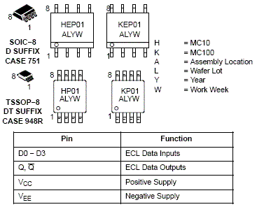 The MC10EP01 is a 4-input OR/NOR gate. The device is functionally equivalent to the EL01 device, LVEL01, and E101 (a quad version). With AC performance much faster than the LVEL01device, the EP01 is ideal for applications requiring the fastest AC performance available.