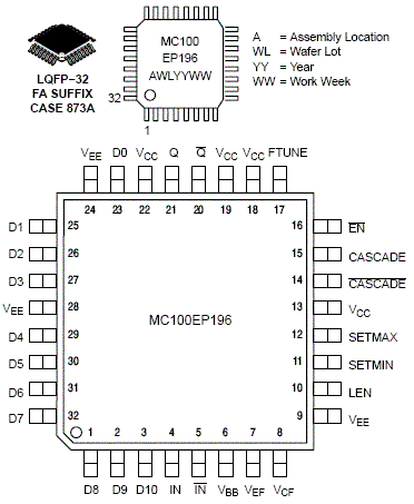 The MC100EP196 is a programmable delay chip (PDC) designed primarily for clock deskewing and timing adjustment. It provides programmably variable delay of a differential ECL input signal. It has similar architecture to the EP195 with the added feature of further tuneability in delay using the FTUNE pin. The FTUNE input takes an analog voltage from V