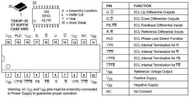 The MC100EP40 is a three-state phase-frequency detector intended for phase-locked loop applications which require a minimum amount of phase and frequency difference at lock. Advanced design significantly reduces the dead zone of the detector. For proper operation, the input edge rate of the R and V inputs should be less than 5 ns. The device is designed to work with a 3.3 V / 5 V power supply.
