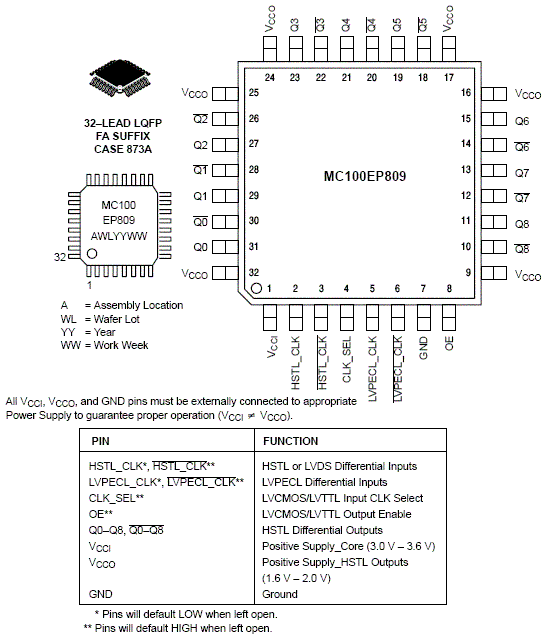 The MC100EP809 is a low skew 2:1:9 differential bus clock driver, designed with clock distribution in mind, accepting two clock sources into an input multiplexer. The part is designed for use in low voltage applications which require a large number of outputs to drive precisely aligned low skew signals to their destination. The two clock inputs are one differential HSTL and one differential LVPECL. Both input pairs can accept LVDS levels. They are selected by the CLK_SEL pin which is LVTTL. To avoid generation of a runt clock pulse when the device is enabled/disabled, the Output Enable (OE), which is LVTTL, is synchronous so that the outputs will only be enabled/disabled when they are already in LOW state.