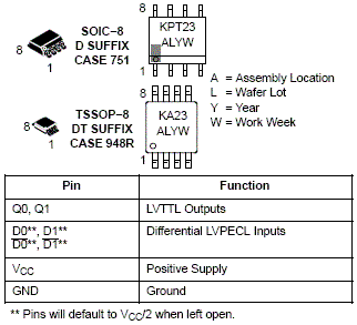 The MC100EPT23 is a dual differential LVPECL/LVDS/CML to LVTTL/LVCMOS translator. Because LVPECL/LVDS/CML input levels and LVTTL/LVCMOS output levels are used only +3.3V and ground are required. The small outline 8-lead SOIC package and the dual gate design of the EPT23 makes it ideal for applications which require the translation of a clock and a data signal.