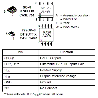 The MC100EPT26 is a 1:2 Fanout Differential LVPECL to LVTTL translator. Because LVPECL (Positive ECL) levels are used only +3.3V and ground are required. The small outline 8-lead SOIC package and the 1:2 fanout design of the EPT26 makes it ideal for applications which require the low skew duplication of a signal in a tightly packed PC board.