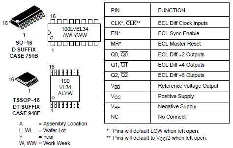 The MC100LVEL34 is a low skew 2, 4, 8 clock generation chip designed explicitly for low skew clock generation applications. The internal dividers are synchronous to each other, therefore, the common output edges are all precisely aligned. The VBB pin, an internally generated voltage supply, is available to this device only. For single−ended input conditions, the unused differential input is connected to VBB as a switching reference voltage. VBB may also rebias AC coupled inputs. When used, decouple VBB and VCC via a 0.01 F capacitor and limit current sourcing or sinking to 0.5 mA. When not used, VBB should be left open.