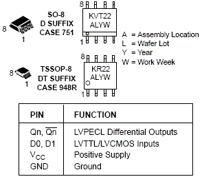 The MC100LVELT22 is a dual LVTTL/LVCMOS to differential LVPECL translator. Because LVPECL (Low Voltage Positive ECL) levels are used, only +3.3V and ground are required. The small outline 8-lead SOIC package and the low skew, dual gate design of the LVELT22 makes it ideal for applications which require the translation of a clock and a data signal.
