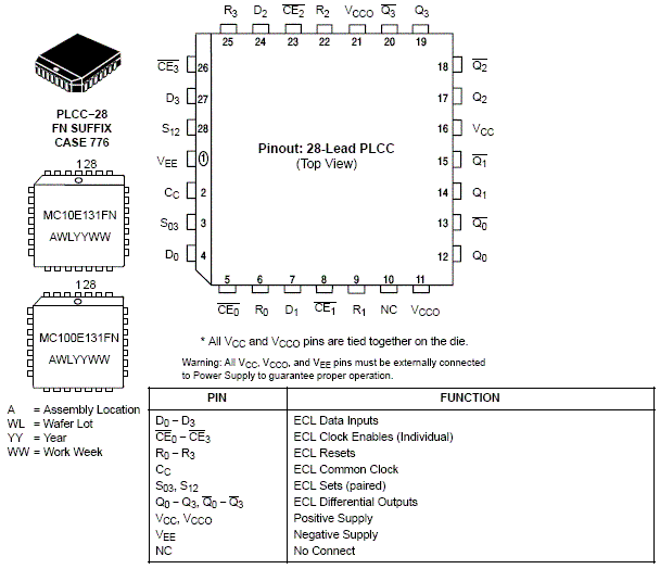 The MC10E/100E131 is a quad master-slave D-type flip-flop with differential outputs. Each flip-flop may be clocked separately by holding Common Clock (C