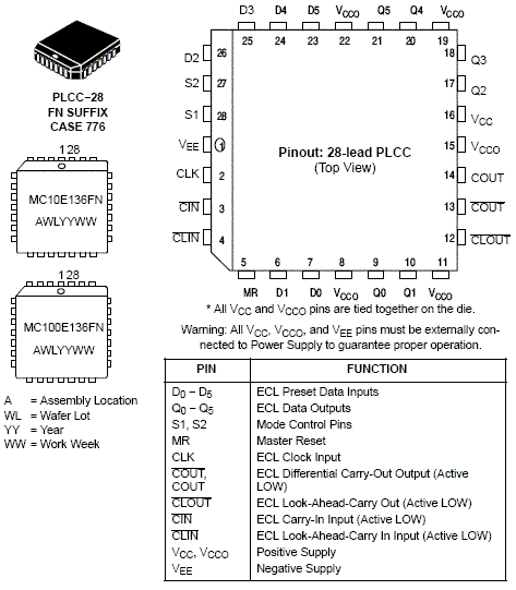 The MC10E/100E136 is a 6-bit synchronous, presettable, cascadable universal counter. The device generates a look-ahead-carry output and accepts a look-ahead-carry input. These two features allow for the cacading of multiple E136's for wider bit width counters that operate at very nearly the same frequency as the stand alone counter.