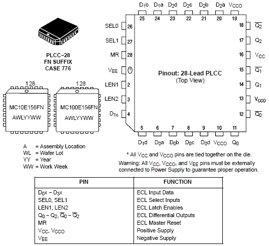 The MC10E/100E156 contains three 4:1 multiplexers followed by transparent latches with differential outputs. When both Latch Enables (LEN1, LEN2) are LOW, the latch is transparent, and output date is controlled by the multiplexer select controls (SEL0, SEL1). A logic HIGH on either LEN1 or LEN2 (or both) latches the outputs. The Master Reset (MR) overrides all other controls to set the Q outputs LOW.