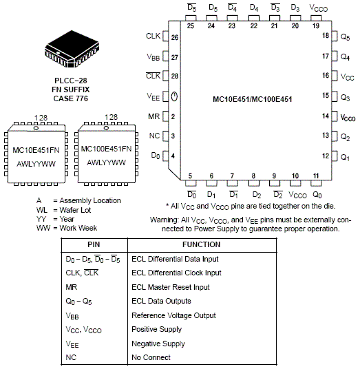 The MC10E/100E451 contains six D-type flip-flops with single-ended outputs and differential data inputs. The common clock input is also differential. The registers are triggered by a positive transition of the positive clock (CLK) input.