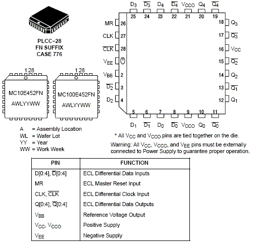 The MC10E/100E452 is a 5-bit differential register with differential data (inputs and outputs) and clock. The registers are triggered by a positive transition of the positive clock (CLK) input. A high on the Master Reset (MR) asynchronously resets all registers so that the Q outputs go LOW.