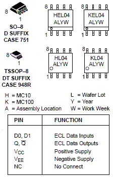 The MC10EL/100EL04 is a 2-input AND/NAND gate. The device is functionally equivalent to the E104 device with higher performance capabilities. With propagation delays and output transition times significantly faster than the E104 the EL04 is ideally suited for those applications which require the ultimate in AC performance.