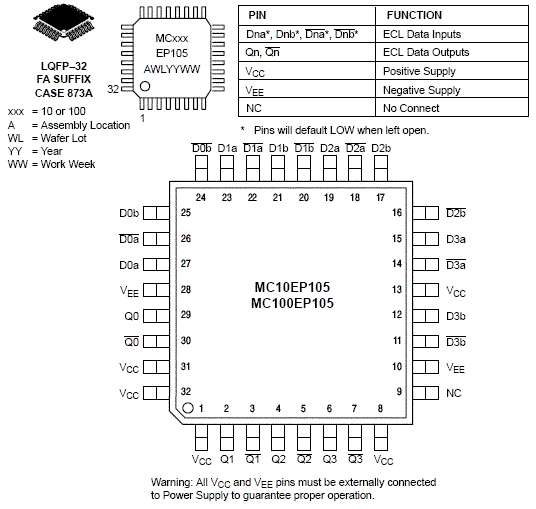 The MC10/100EP105 is a quad 2-input differential AND/NAND gate. Each gate is functionally equivalent to the EP05 and LVEL05 devices. With AC performance much faster than the LVEL05 device, the EP105 is ideal for applications requiring the fastest AC performance available.