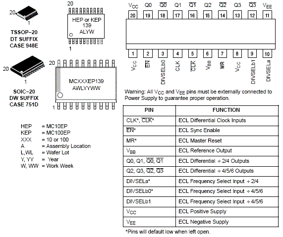 The MC10/100EP139 is a low skew divide by 2/4, divide by 4/5/6 clock generation chip designed explicitly for low skew clock generation applications. The internal dividers are synchronous to each other, therefore, the common output edges are all precisely aligned. The device can be driven by either a differential or single-ended ECL or, if positive power supplies are used, LVPECL input signals. In addition, by using the V