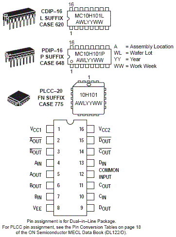 The MC10H101 is a quad 2-input OR/NOR gate with one input from each gate common to pin 12. This MECL 10H part is a functional/pinout duplication of the standard MECL 10K family part, with 100% improvement in propagation delay, and no increases in power-supply current.
