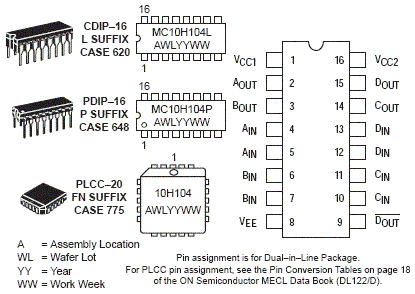 The MC10H104 is a quad 2-input AND gate. One of the gates has both AND/NAND outputs available. This MECL 10H part is a functional/pinout duplication of the standard MECL 10K family part, with 100% improvement in propagation delay, and no increase in power- supply current.