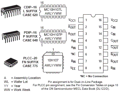 The MC10H107 is a triple 2-input exclusive OR/NOR gate. This MECL 10H part is a functional/pinout duplication of the standard MECL 10K family part, with 100% improvement in propagation delay, and no increase in power-supply current.