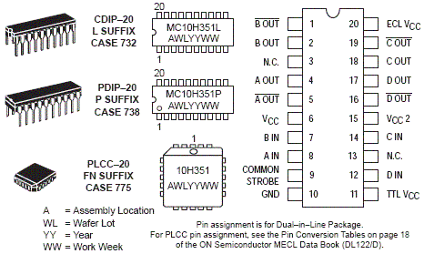 The MC10H351 is a quad translator for interfacing data between a saturated logic section and the PECL section of digital systems when only a +5.0 Vdc power supply is available. The MC10H351 has TTL/NMOS compatible inputs and PECL complementary open-emitter outputs that allow use as an inverting/non-inverting translator or as a differential line driver. When the common strobe input is at a low logic level, it forces all true outputs to the PECL low logic state (+3.2 V) and all inverting outputs to the PECL high logic state (+4.1 V).