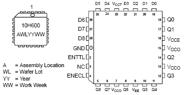 The MC10H/100H600 is a 9-bit, dual supply TTL to ECL translator. Devices in the 9-bit translator series utilize the 28-lead PLCC for optimal power pinning, signal flow-through and electrical performance.