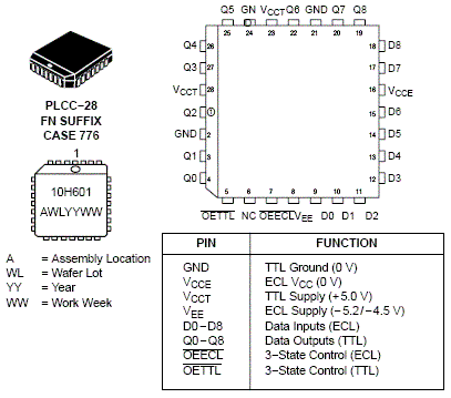 The MC10H/100H601 is a 9-bit, dual supply ECL to TTL translator. Devices in the 9-bit translator series utilize the 28-lead PLCC for optimal power pinning, signal flow-through and electrical performance.