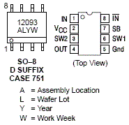 The MC12093 is a single modulus prescaler for low power frequency division of a 1.1 GHz high frequency input signal. MOSAIC V(tm) technology is utilized to achieve low power dissipation of 6.75 mW at a minimum supply voltage of 2.7 V. On-chip output termination provides output current to drive a 2.0 pF (typical) high impedance load. If additional drive is required for the prescaler output, an external resistor can be added parallel from the OUT pin to GND to increase the output power. Care must be taken not to exceed the maximum allowable current through the output. Divide ratio control inputs SW1 and SW2 select the required divide ratio of 2, 4, or 8. Stand-By mode is featured to reduce current drain to 50 uA typical when the standby pin SB is switched LOW disabling the prescaler.