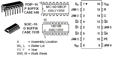 The MC14018B contains five Johnson counter stages which are asynchronously presettable and resettable. The counters are synchronous, and increment on the positive going edge of the clock.