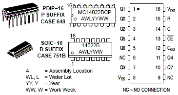 The MC14022B is a four-stage Johnson octal counter with built-in code converter. High-speed operation and spike-free outputs are obtained by use of a Johnson octal counter design. The eight decoded outputs are normally low, and go high only at their appropriate octal time period. The output changes occur on the positive-going edge of the clock pulse. This part can be used in frequency division applications as well as octal counter or octal decode display applications.