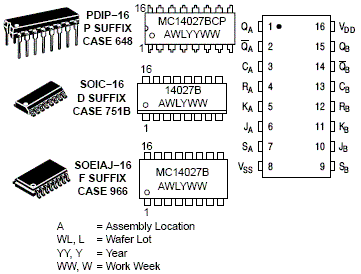 The MC14027B dual JK flip-flop has independent J, K, Clock (C), Set (S) and Reset (R) inputs for each flip-flop. These devices may be used in control, register, or toggle functions.