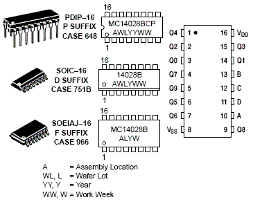 The MC14028B decoder is constructed so that an 8421 BCD code on the four inputs provides a decimal (one-of-ten) decoded output, while a 3-bit binary input provides a decoded octal (one-of-eight) code output with D forced to a logic "0". Expanded decoding such as binary-to-hexadecimal (one-of-16), etc., can be achieved by using other MC14028B devices. The part is useful for code conversion, address decoding, memory selection control, demultiplexing, or readout decoding.