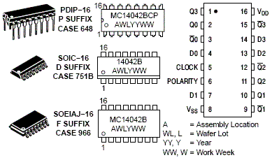 The MC14042B Quad Transparent Latch is constructed with MOS P-channel and N-channel enhancement mode devices in a single monolithic structure. Each latch has a separate data input, but all four latches share a common clock. The clock polarity (high or low) used to strobe data through the latches can be reversed using the polarity input. Information present at the data input is transferred to outputs Q and Q during the clock level which is determined by the polarity input. When the polarity input is in the logic "0" state, data is transferred during the low clock level, and when the polarity input is in the logic "1" state the transfer occurs during the high clock level.
