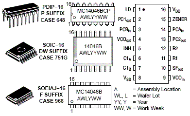 The MC14046B phase locked loop contains two phase comparators, a voltage-controlled oscillator (VCO), source follower, and zener diode. The comparators have two common signal inputs, PCA