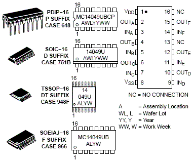 The MC14049UB hex inverter buffer is constructed with MOS P channel and N channel enhancement mode devices in a single monolithic structure.This complementary MOS device finds primaryuse where low power dissipation and or high noise immunity is desired. This device provides logic level conversion using only one supply voltage V