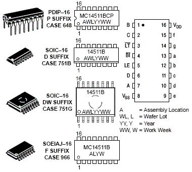 The MC14511B BCD-to-seven segment latch/decoder/driver is constructed with complementary MOS (CMOS) enhancement mode devices and NPN bipolar output drivers in a single monolithic structure. The circuit provides the functions of a 4-bit storage latch, an 8421 BCD-to-seven segment decoder, and an output drive capability. Lamp test (LTbar), blanking (BIbar), and latch enable (LE) inputs are used to test the display, to turn-off or pulse modulate the brightness of the display, and to store a BCD code, respectively. It can be used with seven-segment light-emitting diodes (LED), incandescent, fluorescent, gas discharge, or liquid crystal readouts either directly or indirectly.