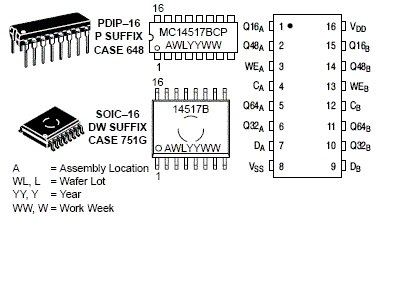 The MC14517B dual 64-bit static shift register consists of two identical, independent, 64-bit registers. Each register has separate clock and write enable inputs, as well as outputs at bits 16, 32, 48, and 64. Data at the data input is entered by clocking, regardless of the state of the write enable input. An output is disabled (open circuited) when the write enable input is high. During this time, data appearing at the data input as well as the 16-bit, 32-bit, and 48-bit taps may be entered into the device by application of a clock pulse. This feature permits the register to be loaded with 64 bits in 16 clock periods, and also permits bus logic to be used. This device is useful in time delay circuits, temporary memory storage circuits, and other serial shift register applications.