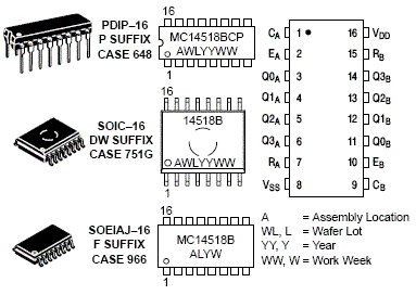 The MC14518B dual BCD counter and the MC14520B dual binarycounter are constructed with MOS P-channel and N-channel enhancement mode devices in a single monolithic structure. Each consists of two identical, independent, internally synchronous 4-stage counters. The counter stages are type D flip-flops, with interchangeable Clock and Enable lines for incrementing on either the positive-going or negative-going transition as required when cascading multiple stages. Each counter can be cleared by applying a high level on the Reset line. In addition, the MC14518B will count out of all undefined states within two clock periods. These complementary MOS up counters find primary use in multi-stage synchronous or ripple counting applications requiring low power dissipation and/or high noise immunity.