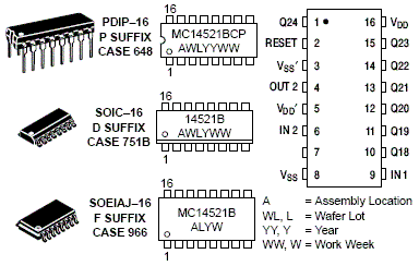 The MC14521B consists of a chain of 24 flip-flops with an input circuit that allows three modes of operation. The input will function as a crystal oscillator, an RC oscillator, or as an input buffer for an external oscillator. Each flip-flop divides the frequency of the previous flip-flop by two, consequently this part will count up to 2