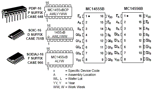 The MC14555B and MC14556B are constructed with complementary MOS (CMOS) enhancement mode devices. Each Decoder/Demultiplexer has two select inputs (A and B), an active low Enable input (E), and four mutually exclusive outputs (Q0, Q1, Q2, Q3). The MC14555B has the selected output go to the "high" state, and the MC14556B has the selected output go to the "low" state. Expanded decoding such as binary-to-hexadecimal (1-of-16), etc., can be achieved by using other MC14555B or MC14556B devices.