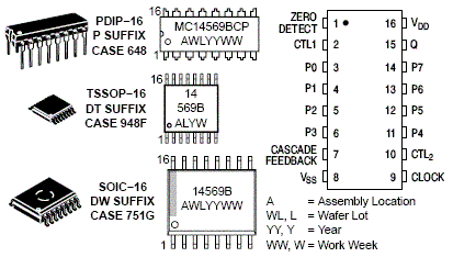 The MC14569B is a programmable divide-by-N dual 4-bit binary or BCD down counter constructed with MOS P-channel and N-channel enhancement mode devices (complementary MOS) in a monolithic structure.