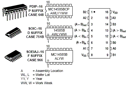The MC14585B 4-Bit Magnitude Comparator is constructed with complementary MOS (CMOS) enhancement mode devices. The circuit has eight comparing inputs (A3, B3, A2, B2, A1, B1, A0, B0), three cascading inputs (AB), and three outputs (AB). This device compares two 4-bit words (A and B) and determines whether they are "less than", "equal to", or "greater than" by a high level on the appropriate output. For words greater than 4-bits, units can be cascaded by connecting outputs (A > B), (AB) on the least significant (first) comparator are connected to a low, a high, and a low, respectively.